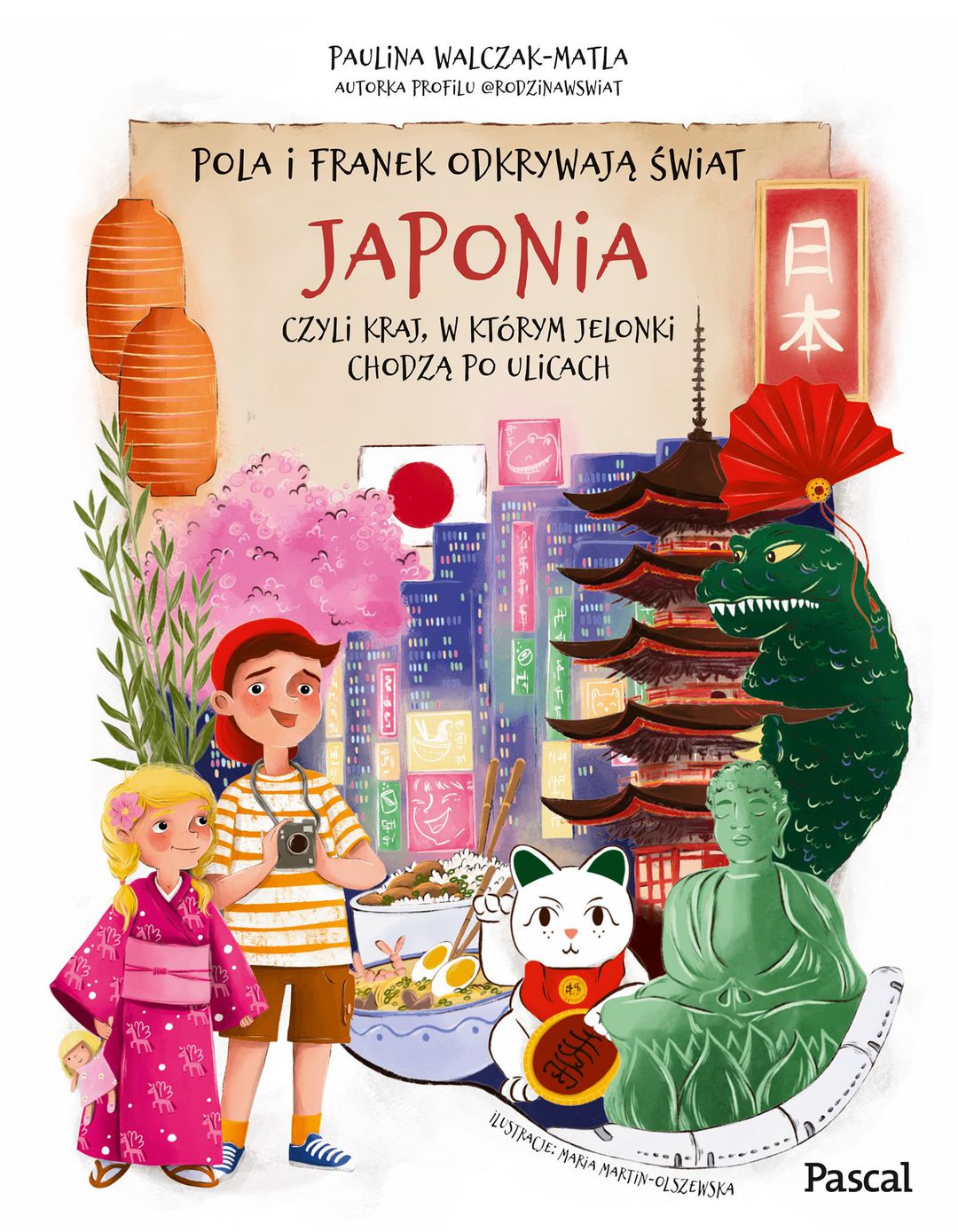 Cześć! To my: Pola i Franek. Razem z rodzicami zwiedzamy świat. Uwielbiamy poznawać nowe kraje i sposoby podróżowania. Polecimy samolotem do Japonii. W Tokio zobaczymy świątynię buddyjską i przywitamy się z Godzillą. Przejedziemy się tokijskim metrem i bardzo szybkim shinkansenem. Przymierzymy kimono i spróbujemy jeść sushi pałeczkami. W Kioto zwiedzimy bambusowy las i dowiemy się, jakie rzeczy można zrobić z bambusa. Zajrzymy do Nary, gdzie znajduje się ogromny posąg Buddy, a jelonki kłaniają się ludziom. Spróbujemy też lokalnych przysmaków. I oczywiście nie zapomnimy kupić pamiątkowego magnesu! Książka dla małych podróżników i ich rodziców. Dzięki niej dzieci będą chętniej odkrywały nowe miejsca i każda rodzinna wyprawa stanie się łatwiejsza!