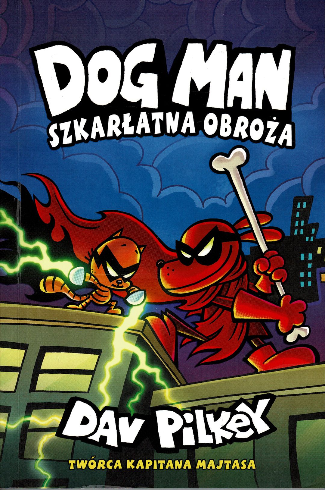 Dwunasty tom komiksu przygodowego o psim superbohaterze. Dog Man został zaatakowany przez skunksa! Po zanurzeniu w soku pomidorowym smród zniknął, ale szkarłatny kolor pozostał. Teraz wygnany superbohater musi walczyć o ocalenie mieszkańców, którzy go odrzucili! Kot Pet niechętnie wraca do przestępczego życia, aby pomóc Dog Manowi. Kto stanie do walki, gdy zupełnie nowy, nigdy wcześniej niewidziany złoczyńca uwolni armię robotów AI?